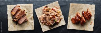 A combination tasting platter of our pulled pork, smoked brisket and a cheese Kransky.