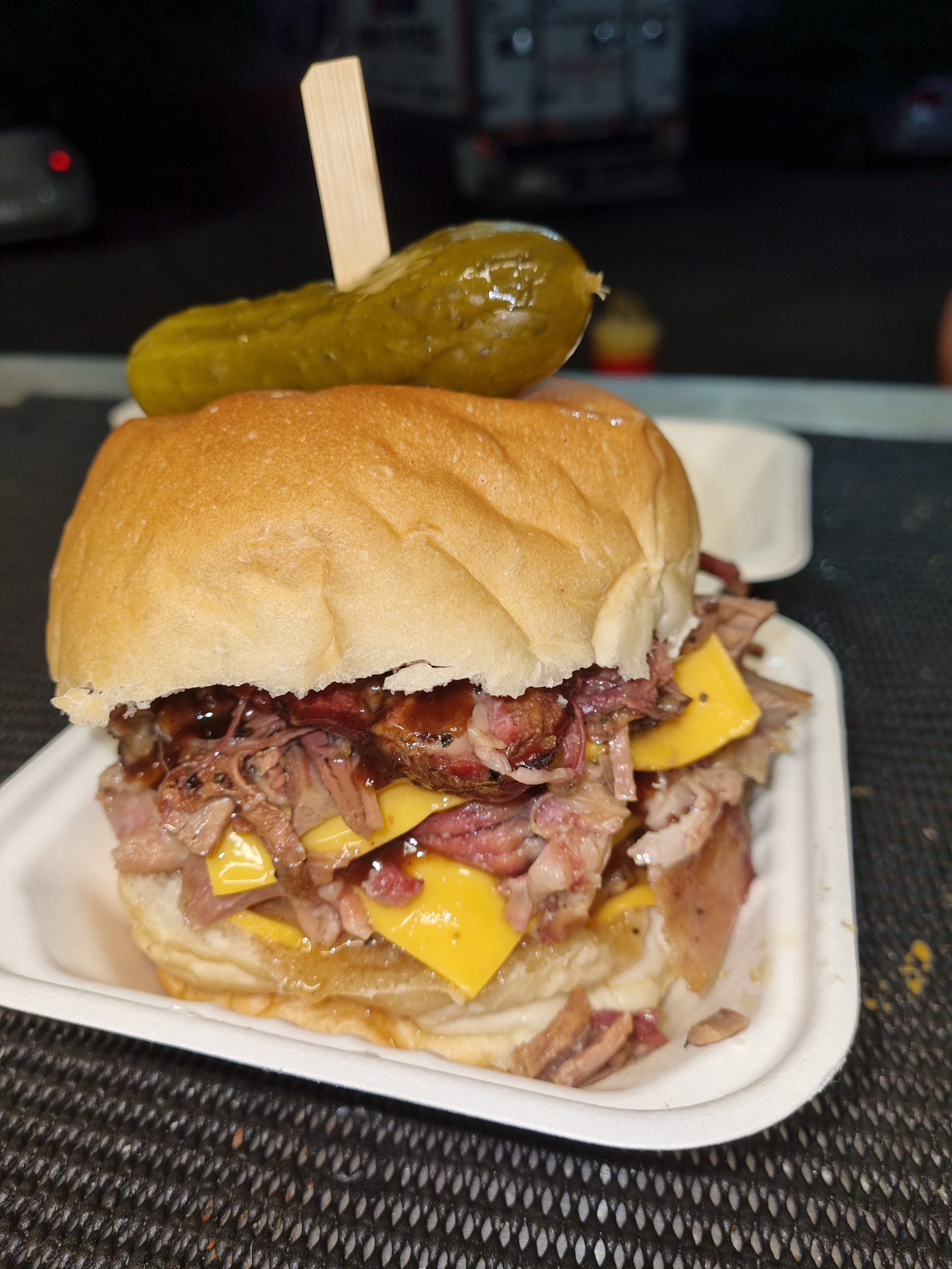 Now we add yet another slice of American cheese which we cover with our moist brisket and more bbq sauce.